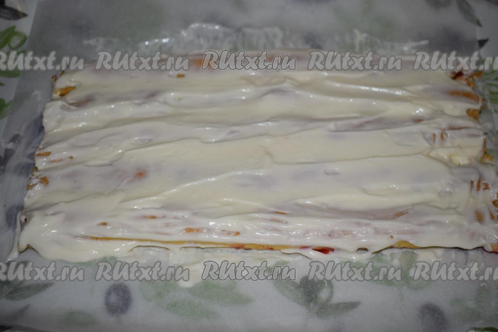Сверху выкладываем 4 трубочки, их также обильно смазываем кремом.
