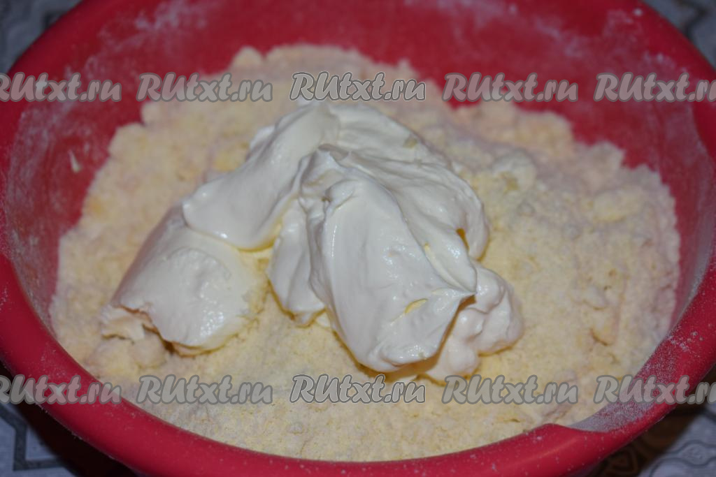 К крошке выкладываем сметану и начинаем замешивать тесто.