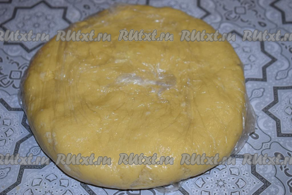 Немного расплющиваем тесто, для того чтобы оно равномерно охладилось, и, завернув в пищевую плёнку, отправляем его в морозилку на 30 минут.