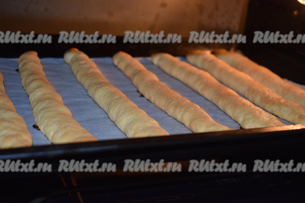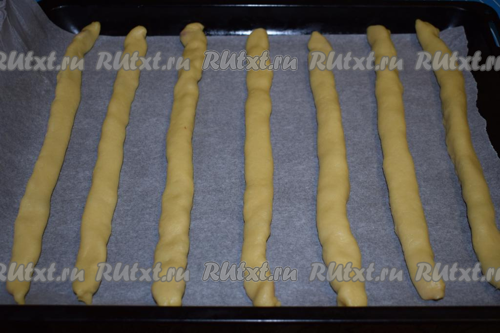 Выкладываем получившиеся трубочки на противень, застеленный пергаментом, соблюдая между трубочками расстояние для того, чтобы они не слиплись друг с другом.