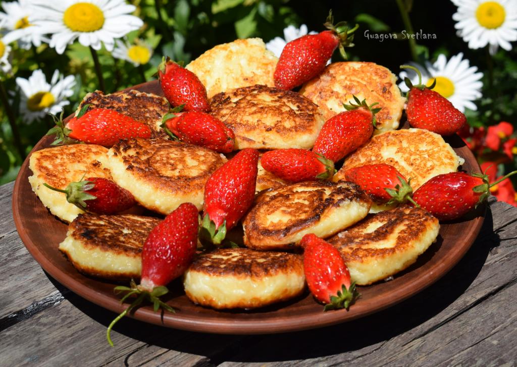Творожники, приготовленные из творога с мукой, перекладываем со сковороды на блюдо, я дополнительно украсила их ягодами клубники. Такие творожники получаются очень нежными, рыхлыми и вкусными. Приготовить их проще простого, а ингредиенты, входящие в их состав, найдутся в каждом доме. Уверена, такие творожники вам точно понравятся!