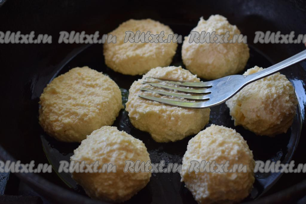 При помощи вилки аккуратно прижимаем шарики, придавая им форму оладушек.