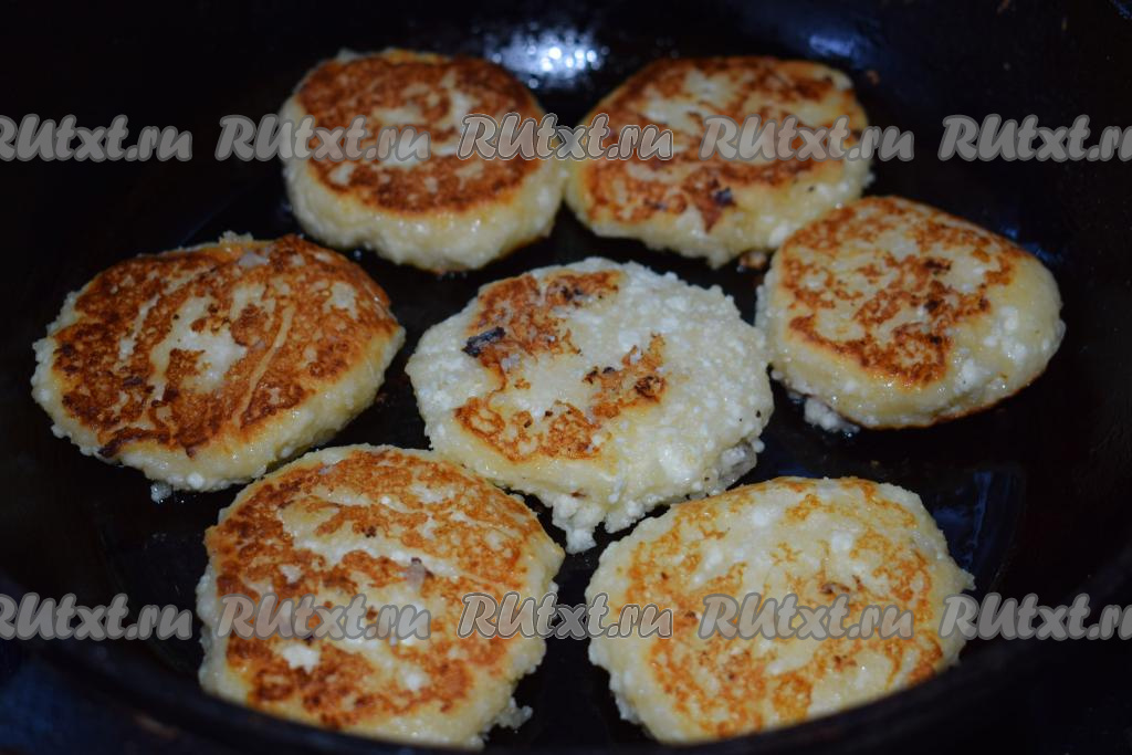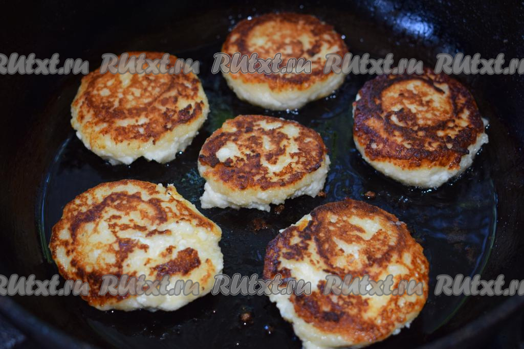 Жарим творожники на среднем огне с двух сторон, примерно, 10-12 минут, пару раз переворачивая их со стороны на сторону.