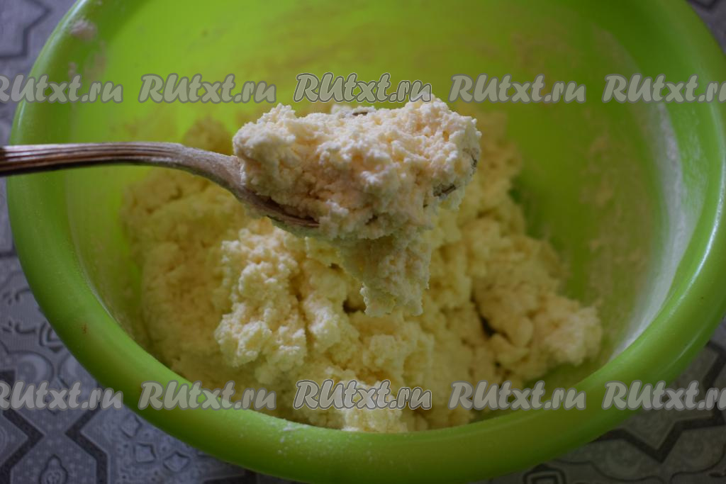 Добавляем к творожной смеси муку и замешиваем тесто при помощи ложки.