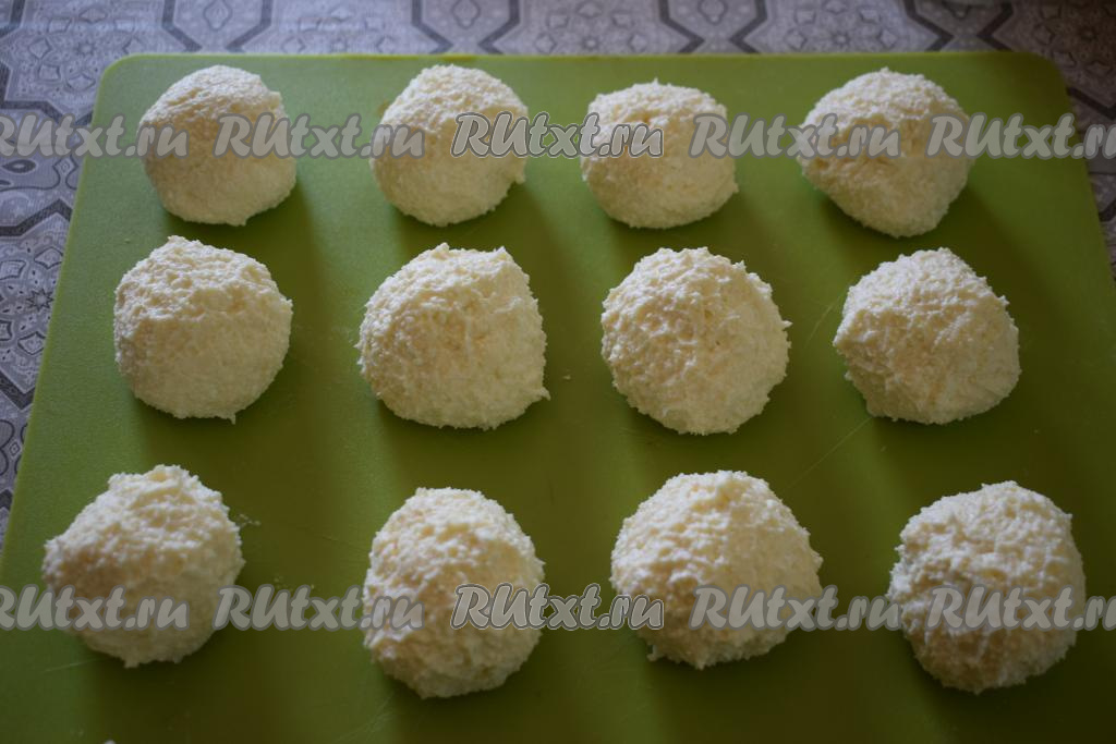 Формируем из теста шарики размером побольше грецкого ореха (у меня получилось 12 штук). Шарики выкладываем на досочку.