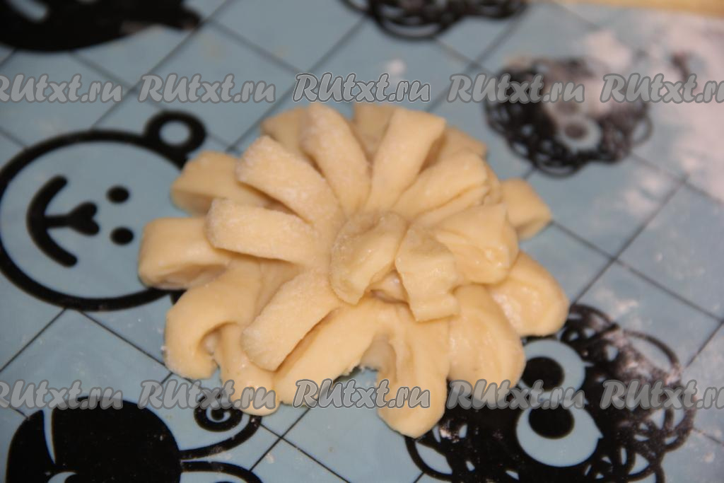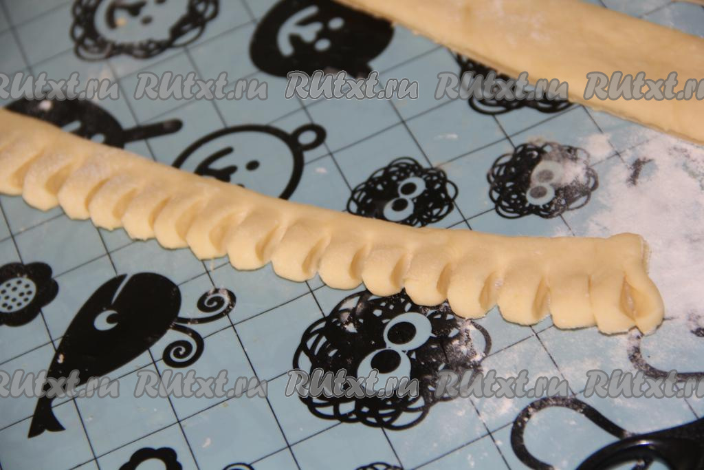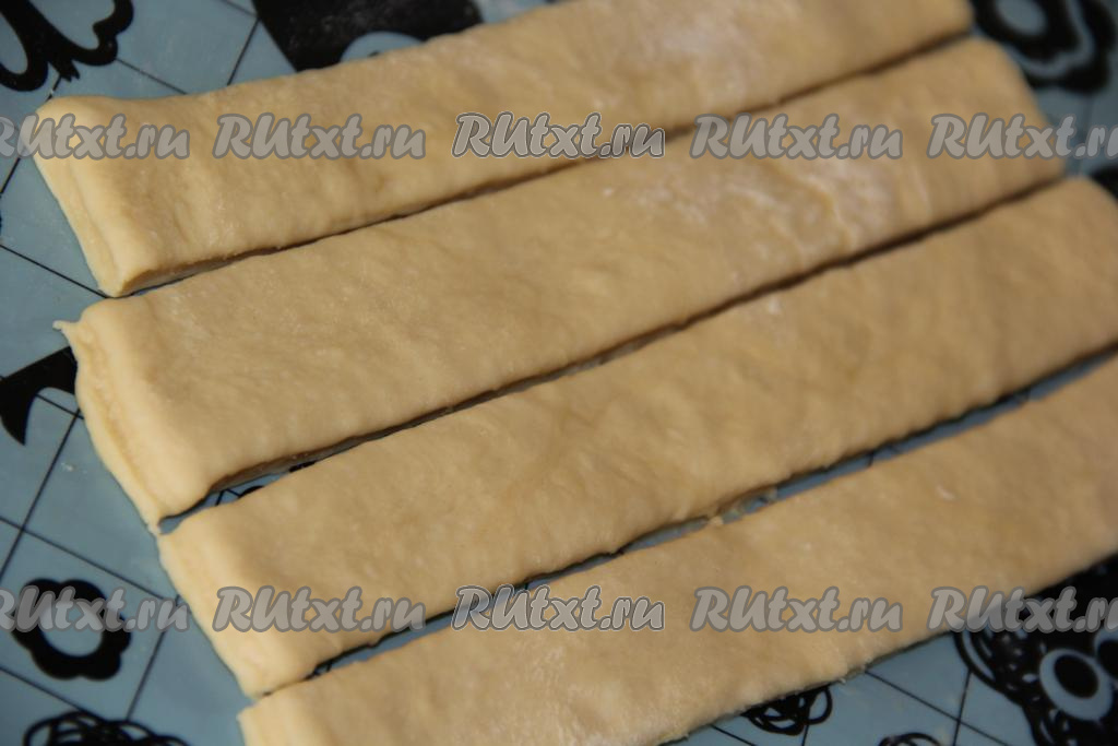 Готовое тесто раскатать в пласт толщиной, примерно, 0,5-0,7 см. Нарезать тесто на полоски шириной, примерно, 2 см (получится 10-12 полосок).