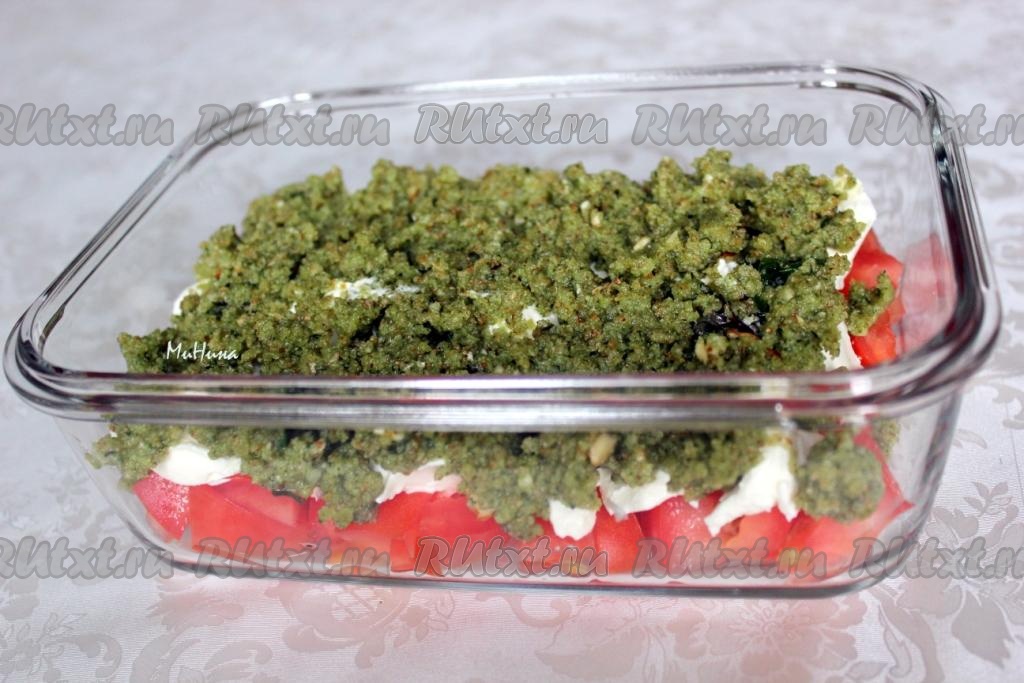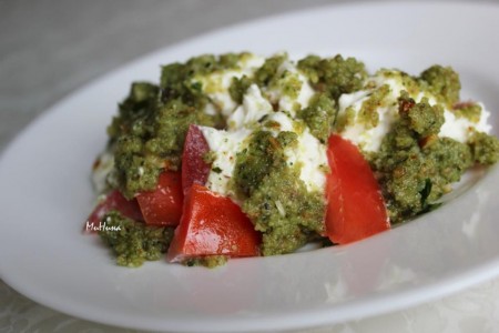 Интересный и вкусный салат с помидорами и песто готов.