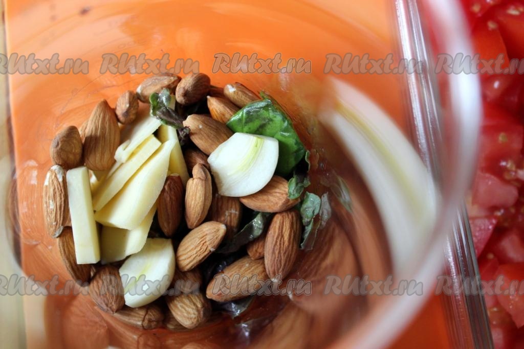 Для песто соедините в стакане блендера базилик, оливковое масло, сыр, чеснок и миндаль.