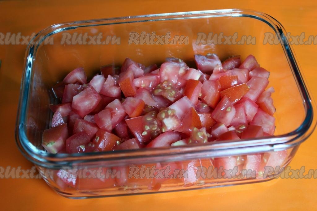 Помидоры нарежьте кубиками и уложите одним слоем в салатник.