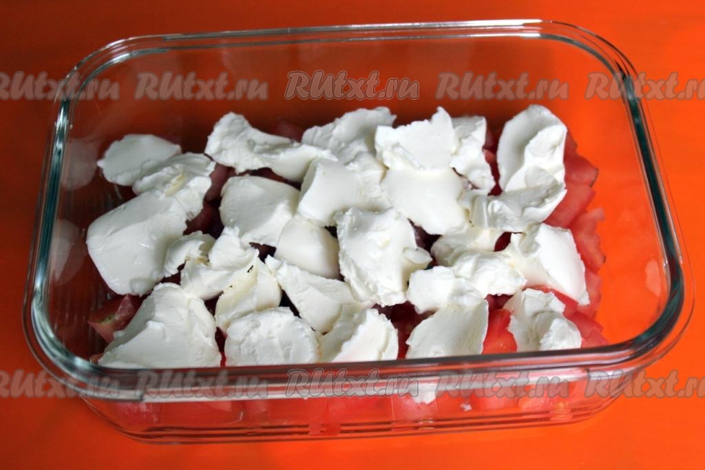 Помидорный слой укройте творожным сыром, выкладывая его ложечкой равномерно порциями.