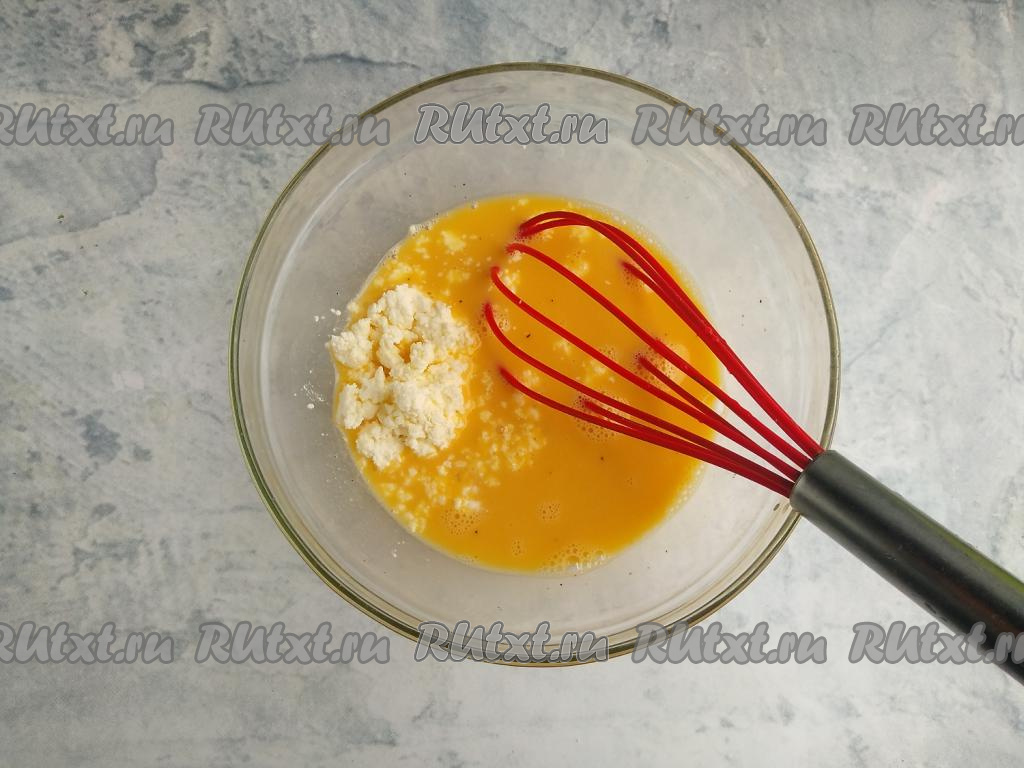 В получившуюся массу выложить творог, снова перемешать венчиком омлетную смесь до однородности.