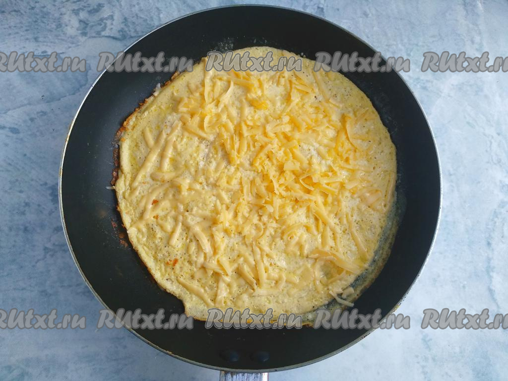 Сыр натереть на крупной тёрке, посыпать им омлет. Продолжить готовить блюдо под крышкой на минимальном огне около 1-2 минут (до расплавления сыра).