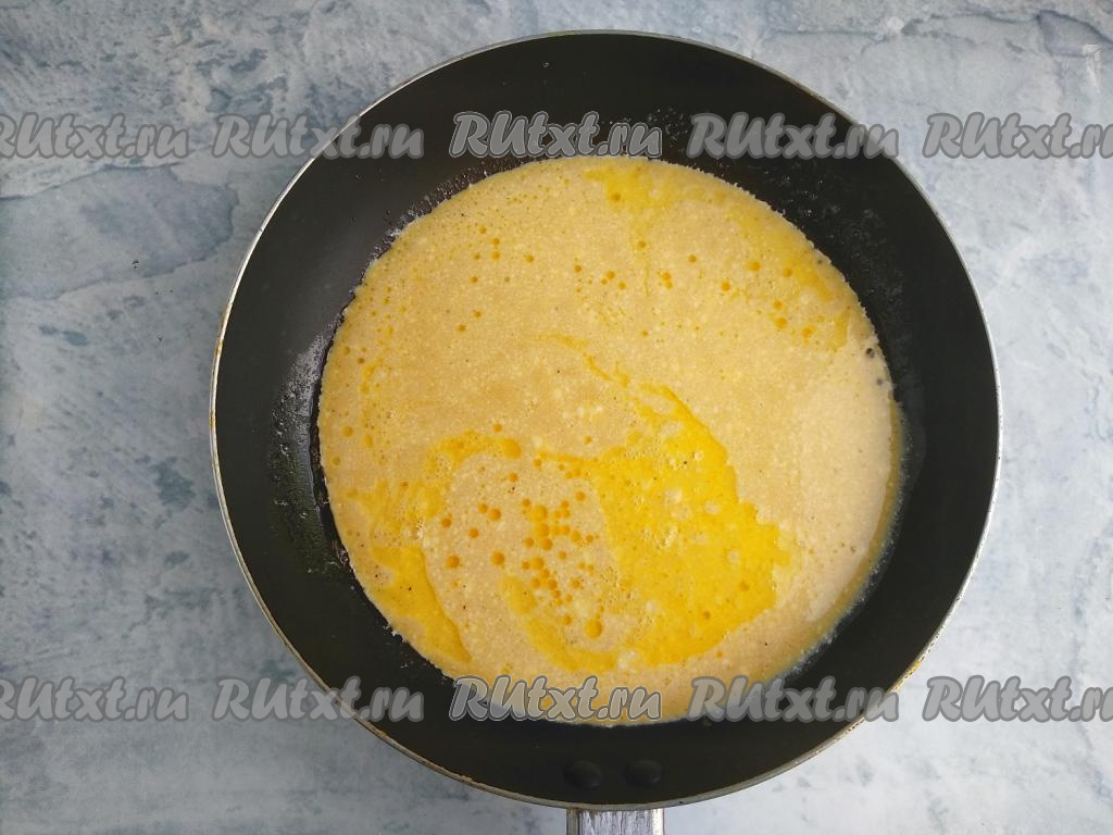 Сковороду с растительным и сливочным маслом нагреть. Вылить омлетную смесь и равномерно её распределить по поверхности. Накрыть сковороду крышкой и жарить омлет на минимальном огне до устойчивой структуры (около 4-5 минут).