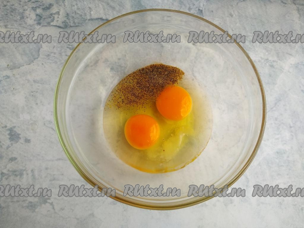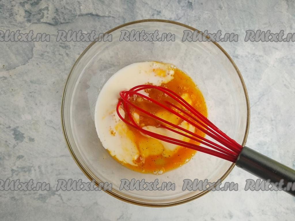 К яйцам с солью влить сливки (или молоко) и с помощью венчика перемешать массу до однородности.