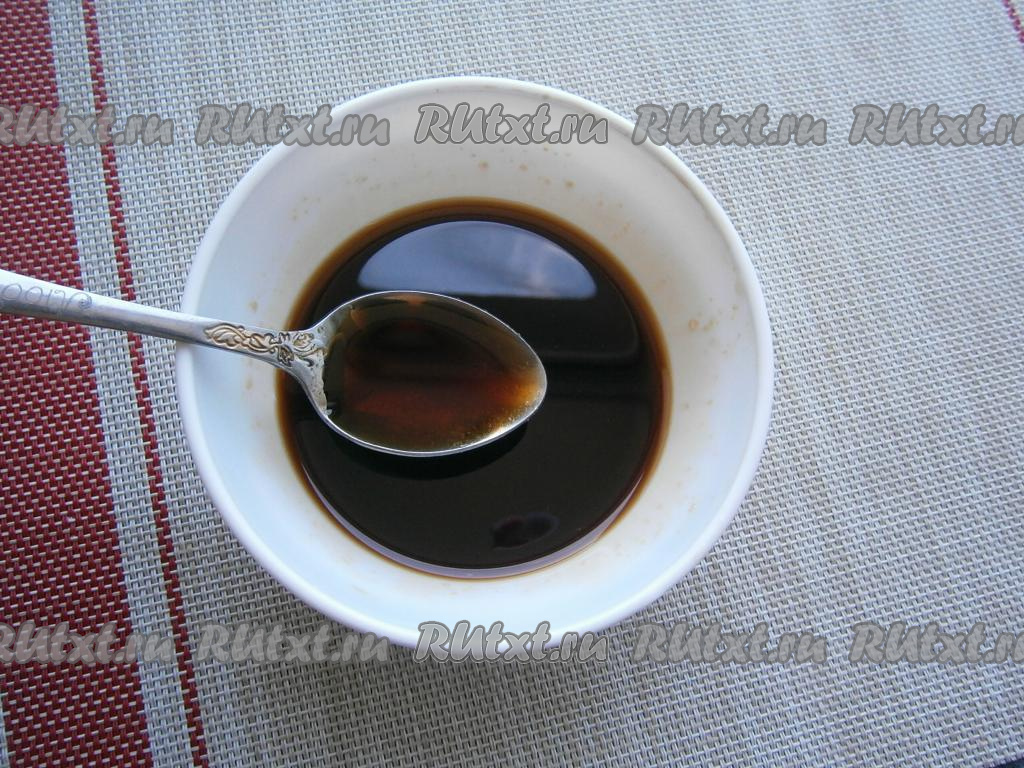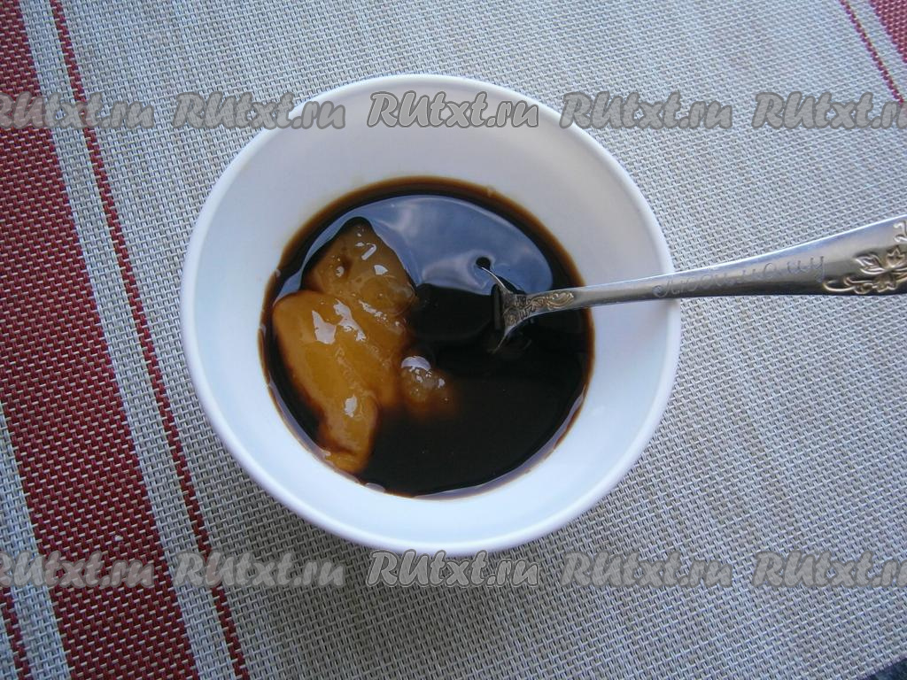 В отдельной ёмкости соединить соевый соус и пчелиный мёд, перемешать.