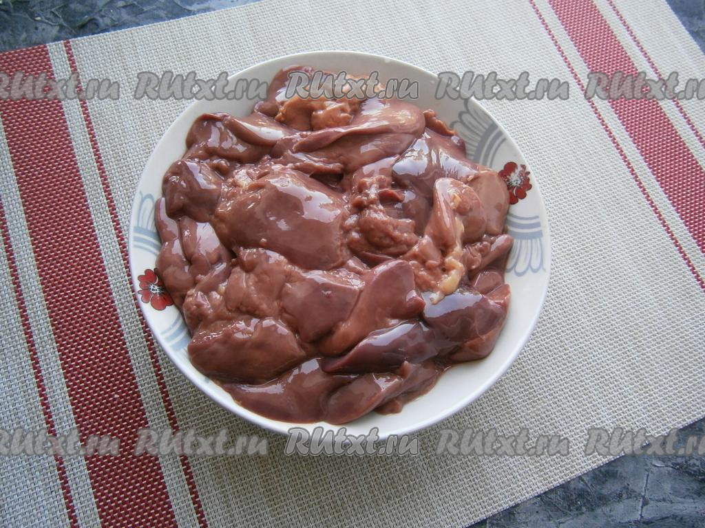 Куриную печень промыть, обсушить и разрезать на 2-4 части.