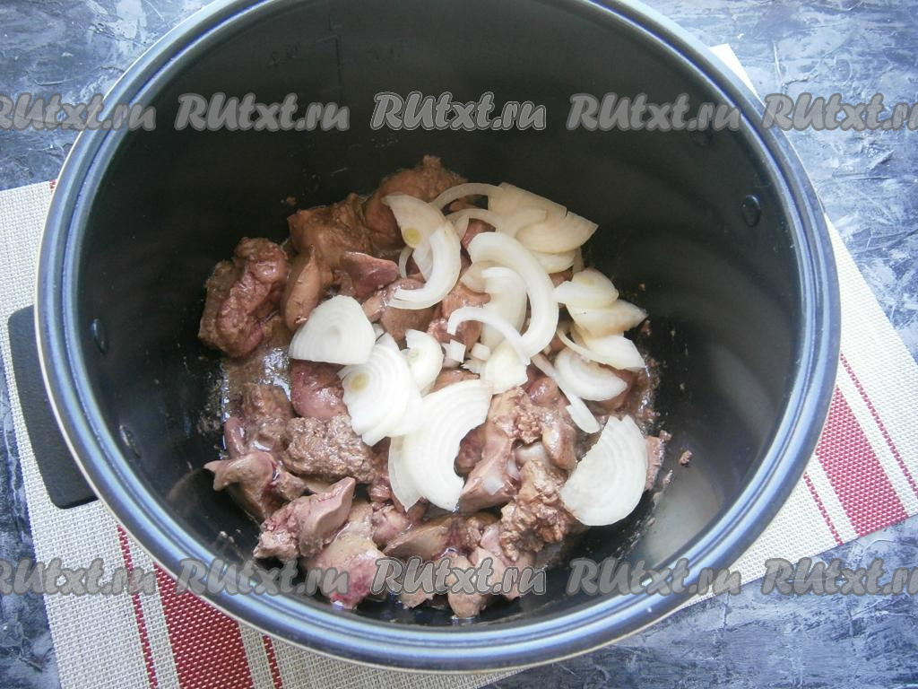 Очистить и нарезать полукольцами луковицу, выложить к куриной печени, перемешать, обжаривать далее, иногда перемешивая, до сигнала мультиварки.