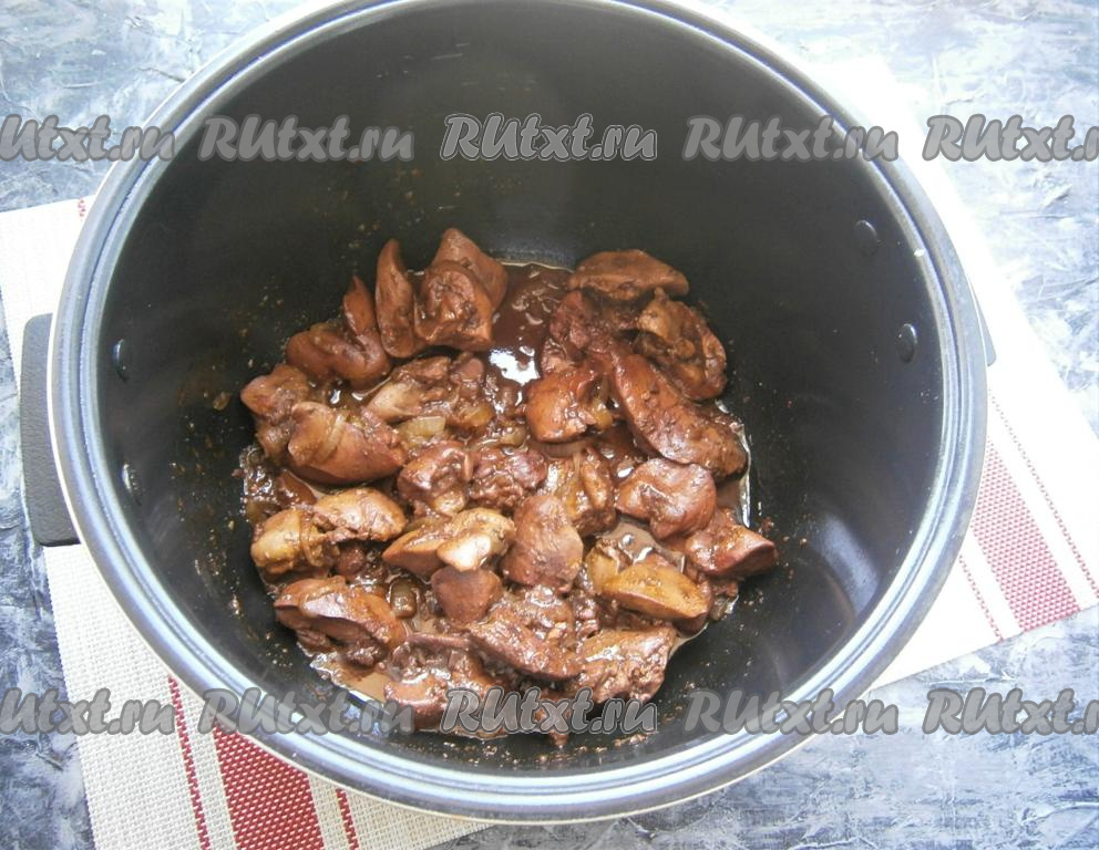 Закрыть мультиварку крышкой и выставить программу "Тушение" на 10 минут. Куриная печень приобретёт красивый оттенок и останется сочной. Соль я не добавляла, мне хватило её от соевого соуса.