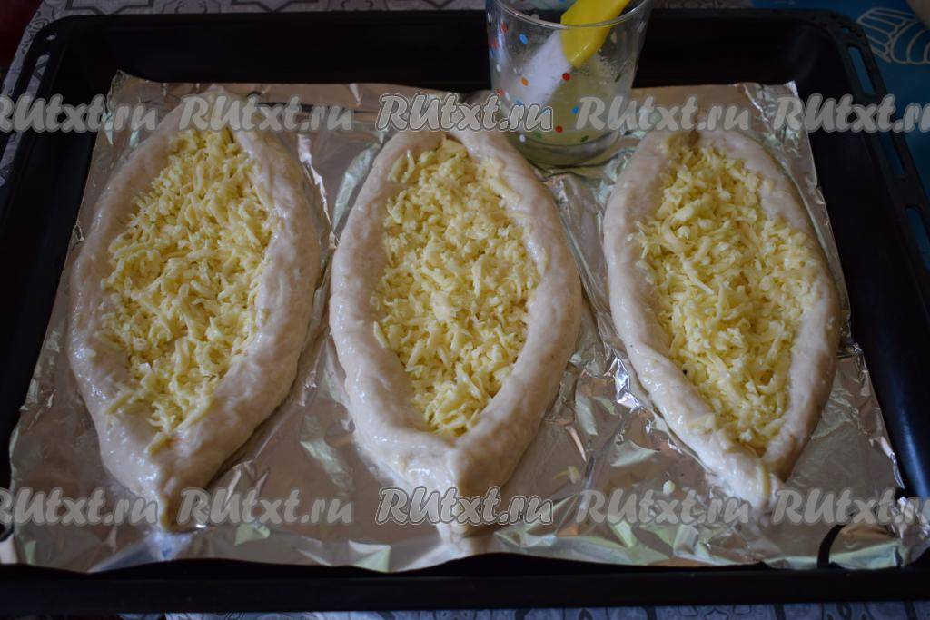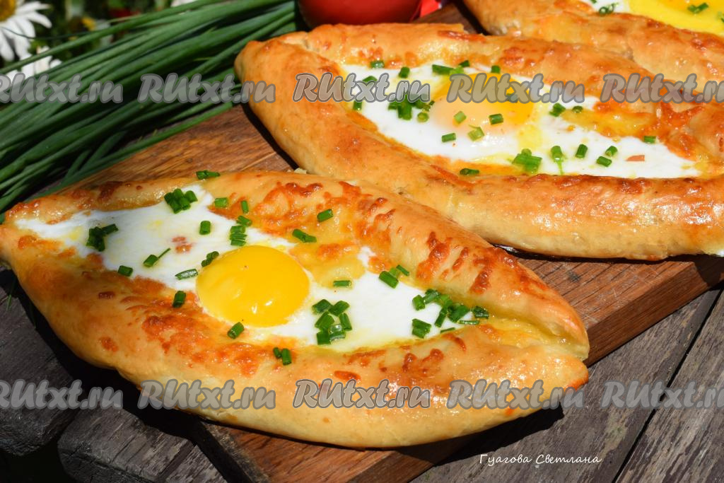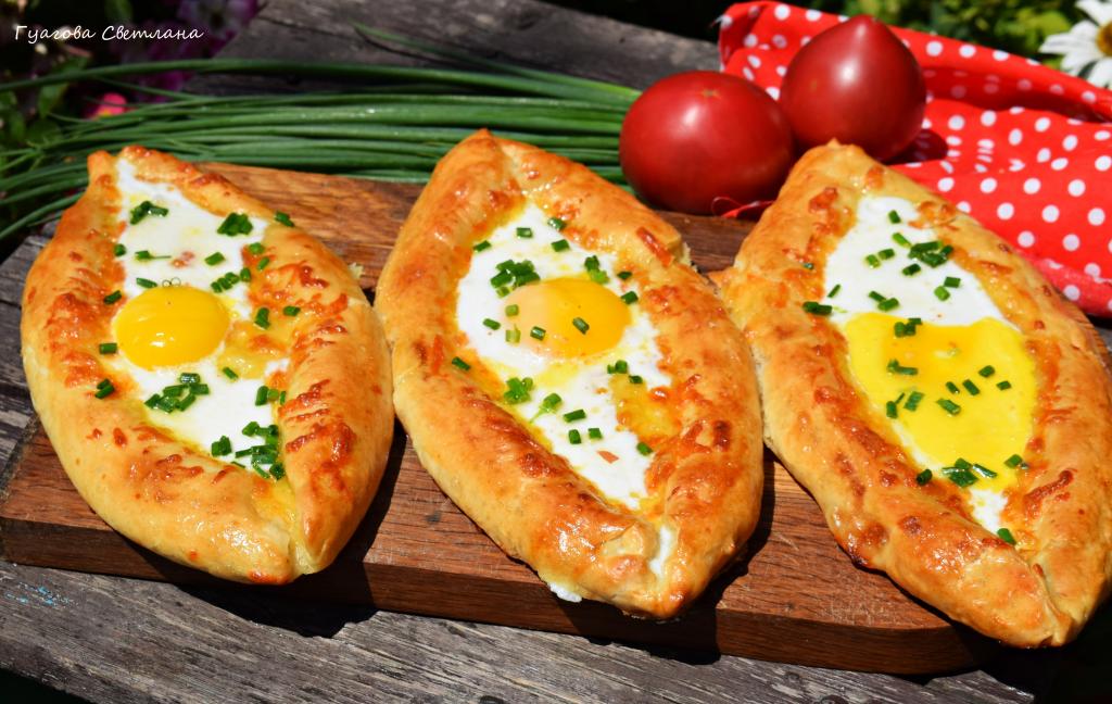 Наши хачапури "Лодочки" с сыром и яйцом готовы. По желанию, можно посыпать их мелко рубленным зелёным луком.