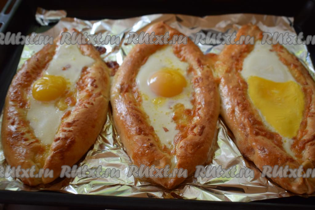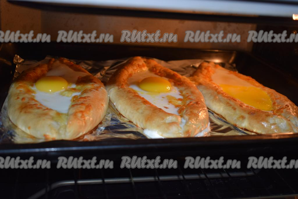 Отправляем наши аджарские хачапури "Лодочки" с яйцом в духовку и запекаем ещё 8-10 минут (до схватывания белка, желток должен остаться жидким).