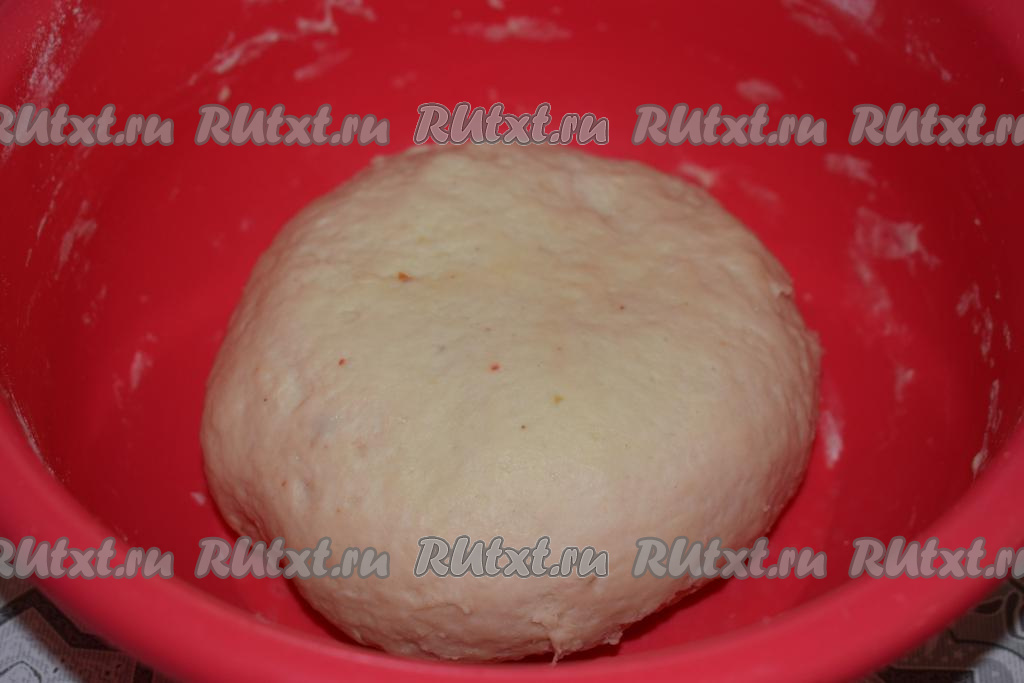 Вымешиваем тесто около 8-10 минут. По консистенции тесто должно получиться гладким, лёгким и мягким, не липнущим к рукам. Накрываем миску с тестом плёнкой и оставляем в тёплом месте на расстойку, примерно, на 1 час.