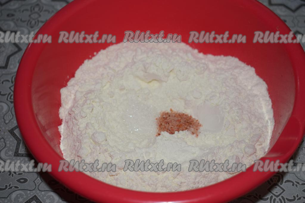 Для замешивания теста всыпаем в миску муку, кладём сахар, соль (у меня чесночная соль) и перемешиваем между собой, мучная смесь должна стать однородной.