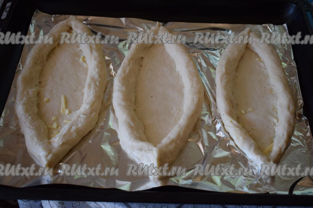 Слепляем края свёрнутого теста, образуя лодочку.