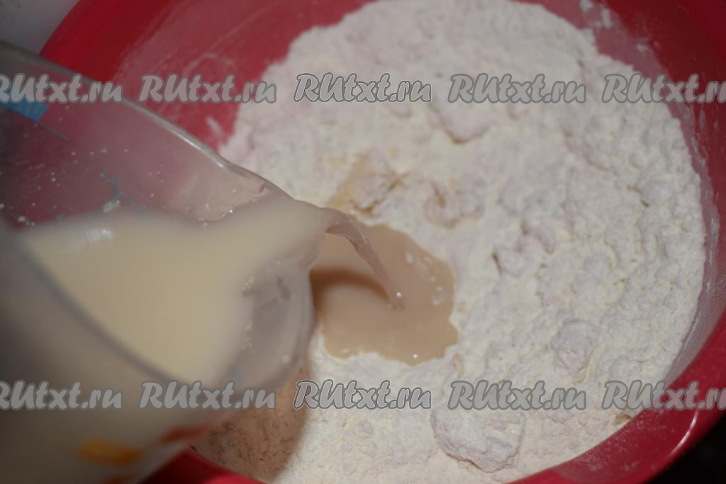 Сырые прессованные дрожжи размешиваем в тёплой воде (температура воды не выше 40 градусов) и даём постоять минут 8-10, чтобы дрожжи активировались. Если вы используете сухие дрожжи, то просто добавьте их к мучной смеси и влейте тёплую воду.