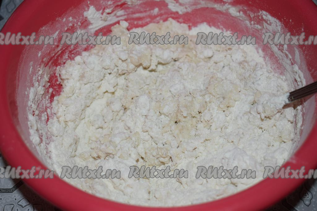 Сначала замешиваем тесто при помощи ложки, а когда тесто начнет сворачиваться в ком, то переходим к замесу руками.