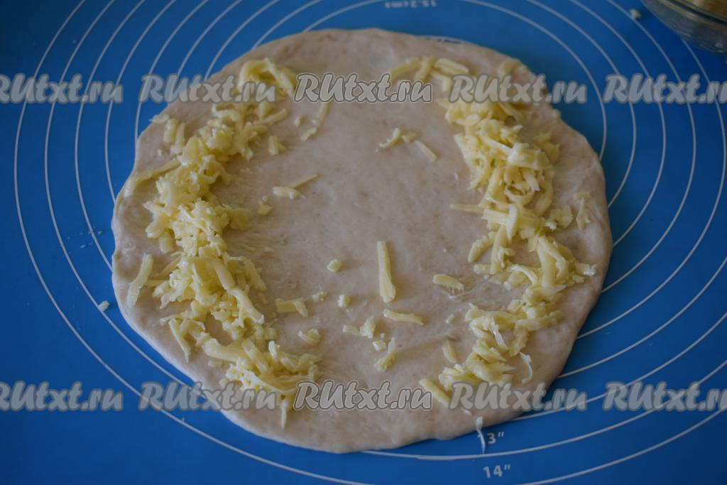 Далее каждый кусок теста раскатываем в круглую лепёшку диаметром, примерно, 24 см. Начинку визуально делим на 4 части для приготовления 4 хачапури. Далее часть начинки выкладываем на края теста (как на фото).