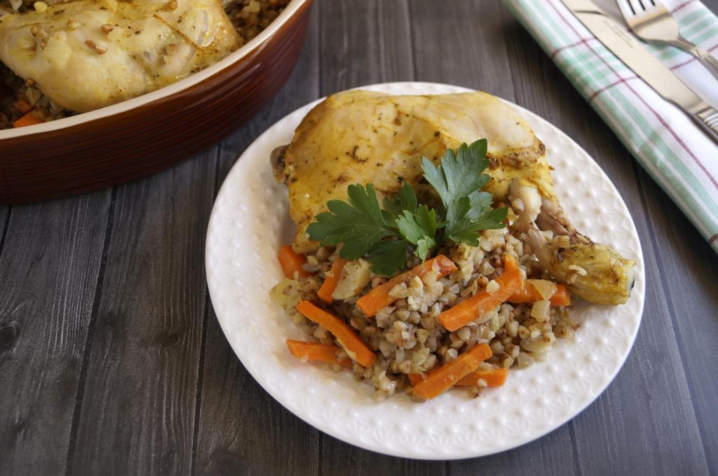 Хочу поделиться простым и одновременно очень удачным рецептом приготовления гречки с куриными окорочками в духовке. Из самых доступных ингредиентов можно приготовить очень вкусный, а главное - полезный обед или ужин. В духовке гречка получается особенно ароматной и аппетитной. А благодаря тому, что во время приготовления она пропитывается соком мяса и овощей, ещё и очень сочной. Предварительное маринование куриных окорочков делает их нежными и очень вкусными. Предлагаю приготовить это замечательное блюдо!