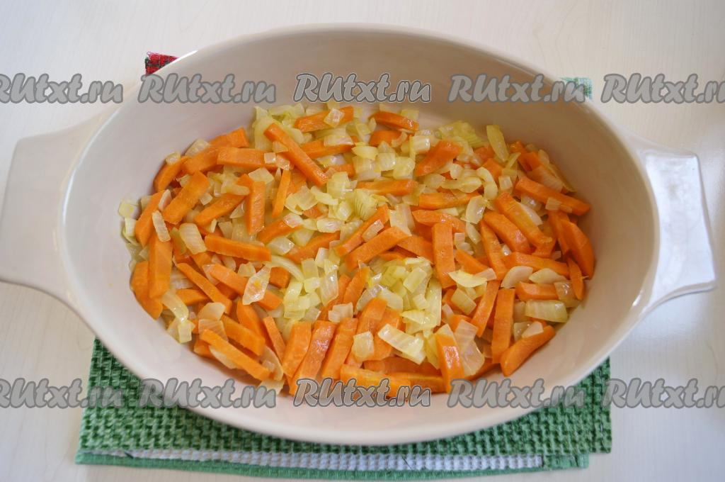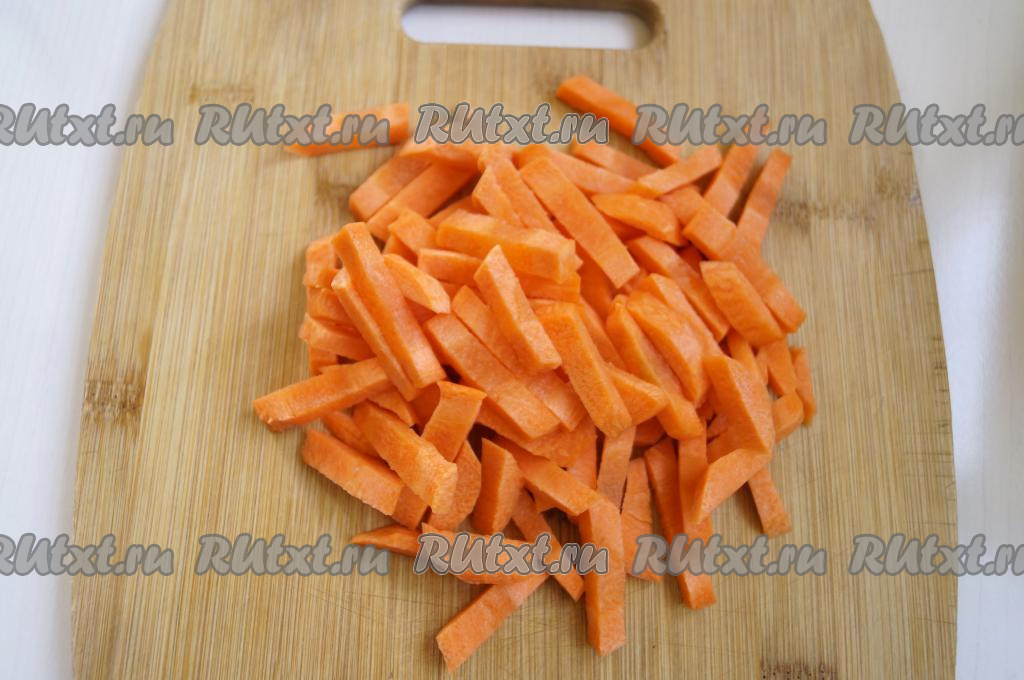 Морковь нарезать брусочками (или соломкой) размером, примерно, 4х0,5 см. Такая нарезка не позволит овощам потерять свою форму в процессе запекания, а значит готовое блюдо будет выглядеть и аппетитно, и красиво.