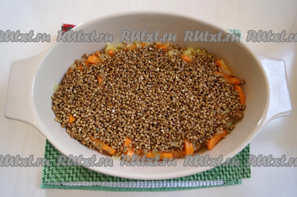 Гречневую крупу необходимо промыть и перебрать, если это потребуется. А затем выложить крупу в форму к обжаренным овощам, посолить и поперчить по вкусу.