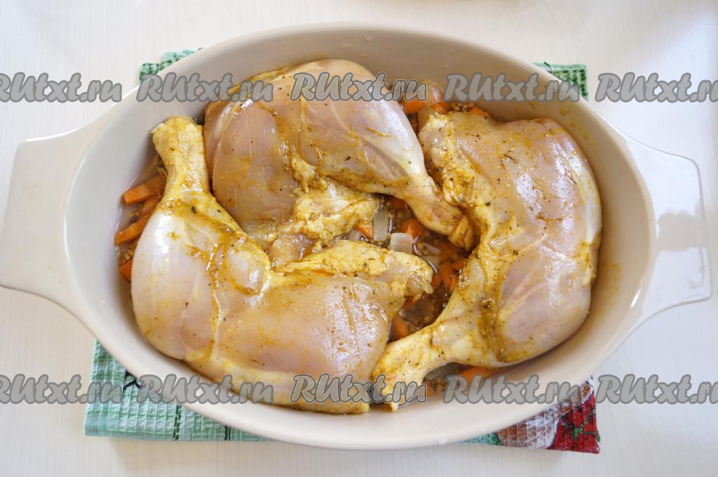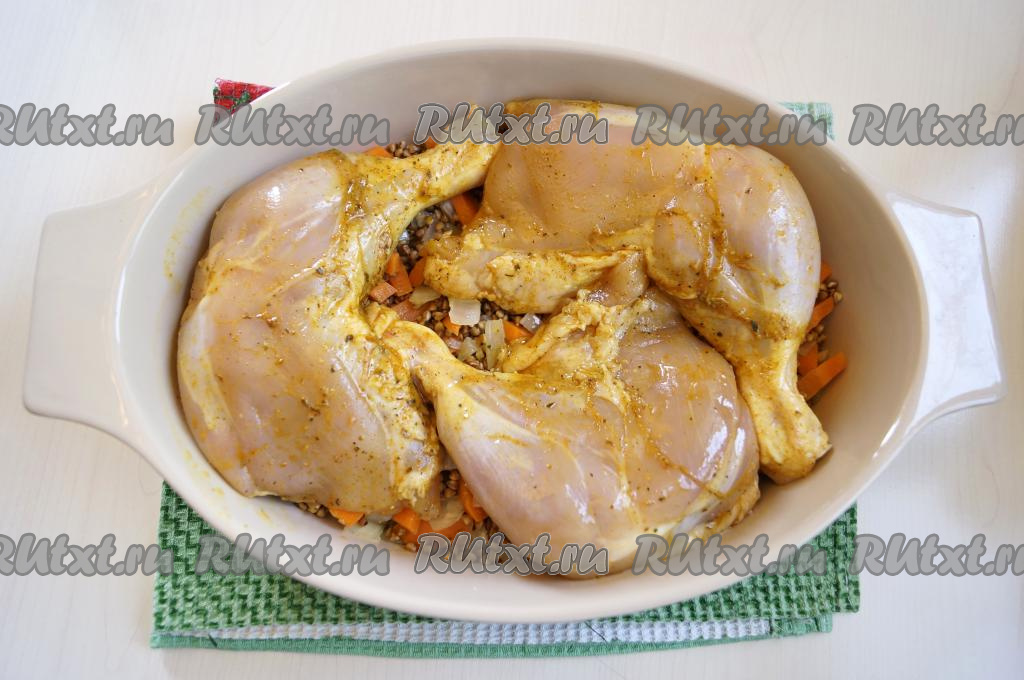 Перемешать гречку с овощами и разровнять. Сверху выложить куриные окорочка.
