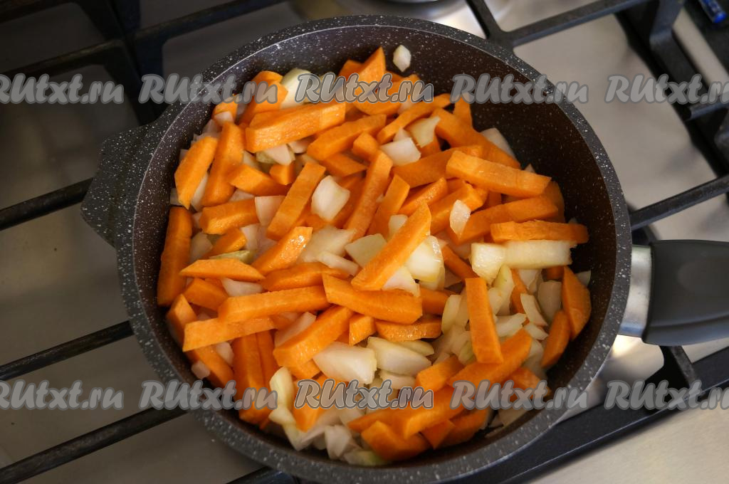В сковороду налить 1 столовую ложку растительного масла, выложить морковь с луком и обжарить на среднем огне, постоянно помешивая, примерно, 3-5 минут. Овощи должны стать мягкими.