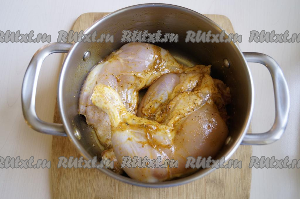 Вылить маринад к куриным окорочкам, посолить по вкусу. Хорошо перемешать руками, втирая маринад и соль в курицу. Накрыть миску с окорочками крышкой (или пищевой плёнкой) и убрать в холодильник на 1 час.
