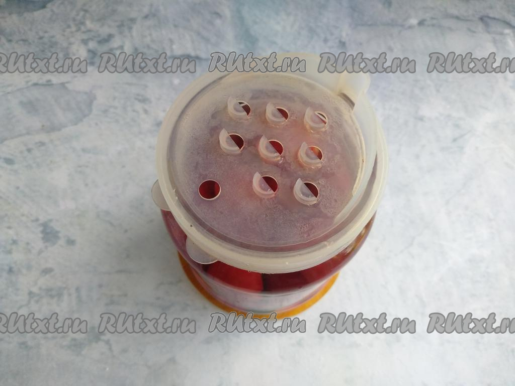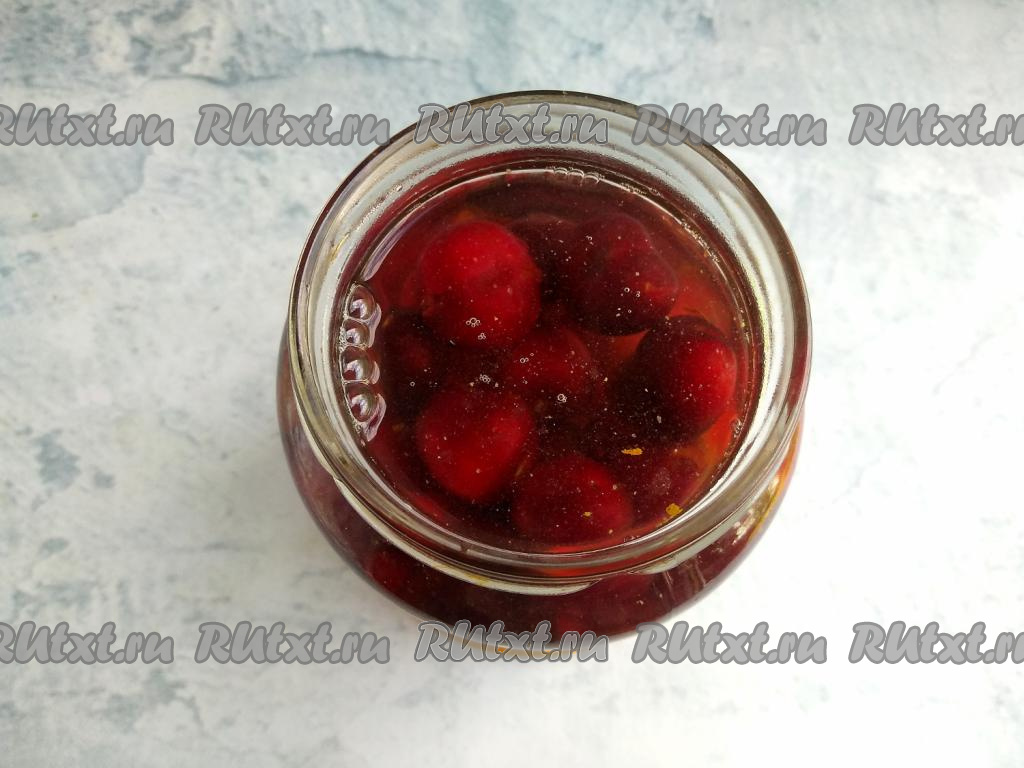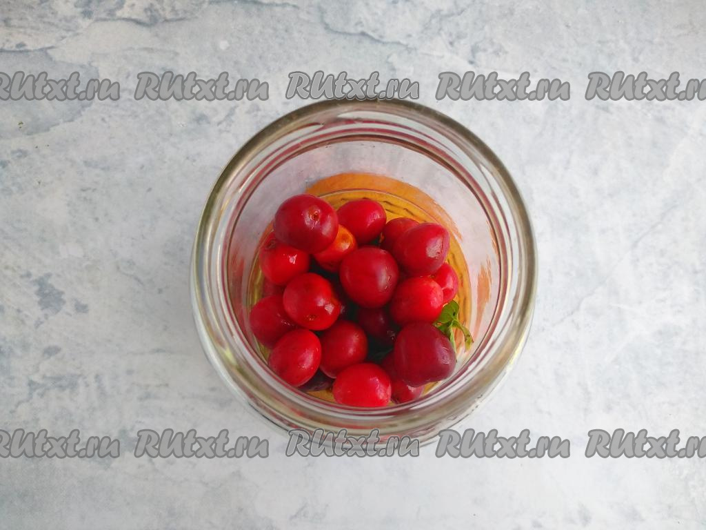 Залить банку с черешней до горлышка кипящей водой, неплотно накрыть крышкой. Укутать в полотенце и оставить на 30 минут для прогревания.
