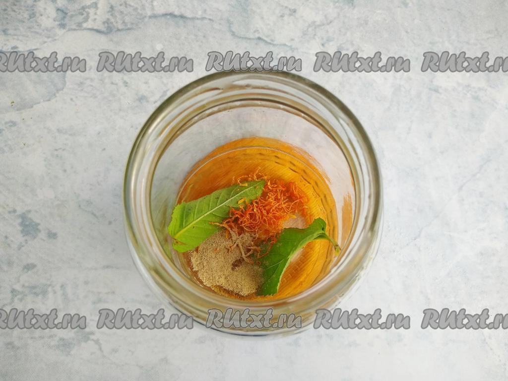 Чистую 1-литровую банку простерилизовать в СВЧ печи (для этого нужно налить в банку 50 мл воды комнатной температуры, поставить в микроволновку на полную мощность на 3-4 минуты). Крышку ошпарить кипятком. Листочки мяты промыть. На дно банки выложить мяту, кардамон и цедру апельсина.