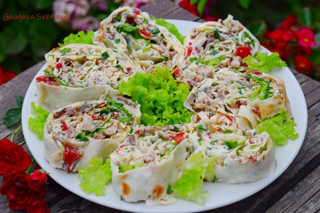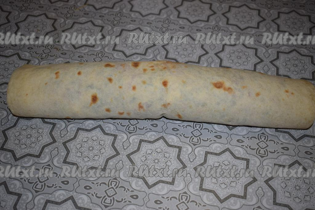 Далее плотно сворачиваем наш лаваш с начинкой в рулет, скручивая широкую сторону.