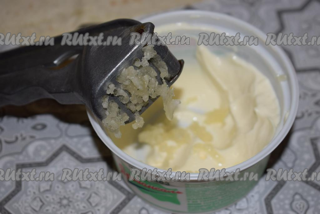 Приготовим соус для смазки лаваша, для этого в майонез выдавливаем при помощи чеснокодавки чеснок и перемешиваем.
