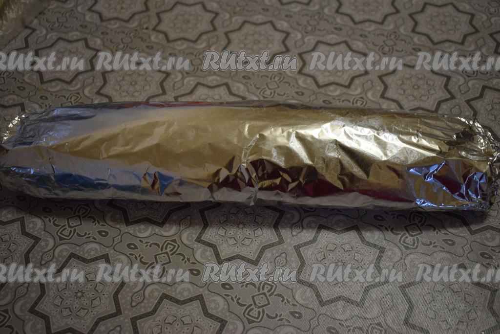 Заворачиваем рулет из лаваша и консервированной скумбрии в фольгу (или пищевую плёнку) и отправляем в холодильник минимум на 3 часа. Лучше оставить рулет в холодильнике на ночь для пропитки.