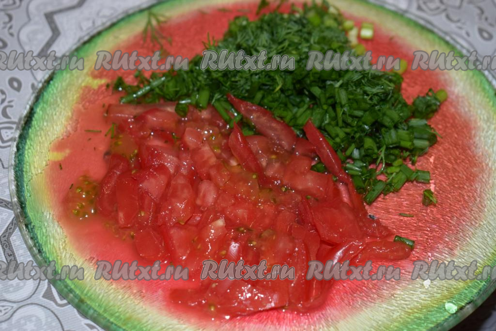 Нарезаем помидор на мелкие кубики, лук и укроп мелко шинкуем. Сливаем сок, образовавшийся при нарезке помидора.