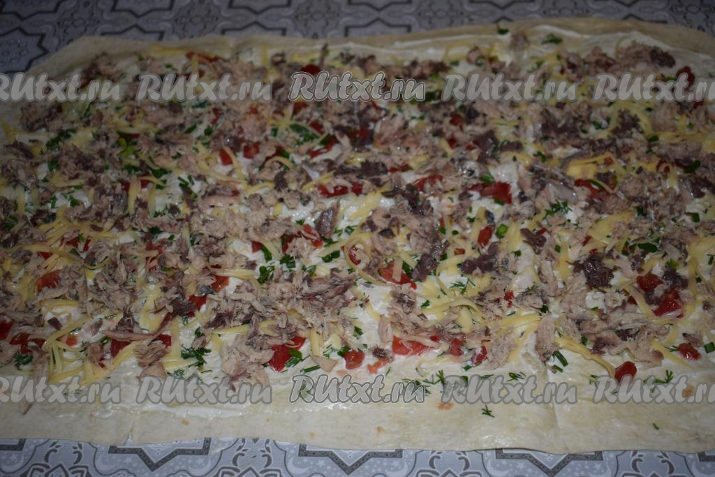Размятую консервированную скумбрию равномерно раскладываем по поверхности лаваша.