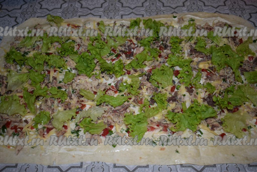 Листья салата тщательно промываем под проточной водой, обсушиваем и разрываем на мелкие кусочки, а затем раскладываем по лавашу с начинкой.