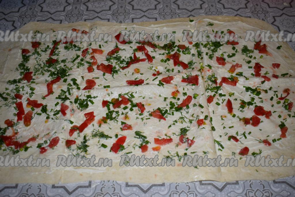 Раскладываем зелень и помидор по всей поверхности лаваша.