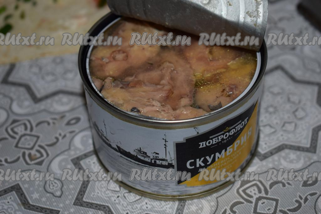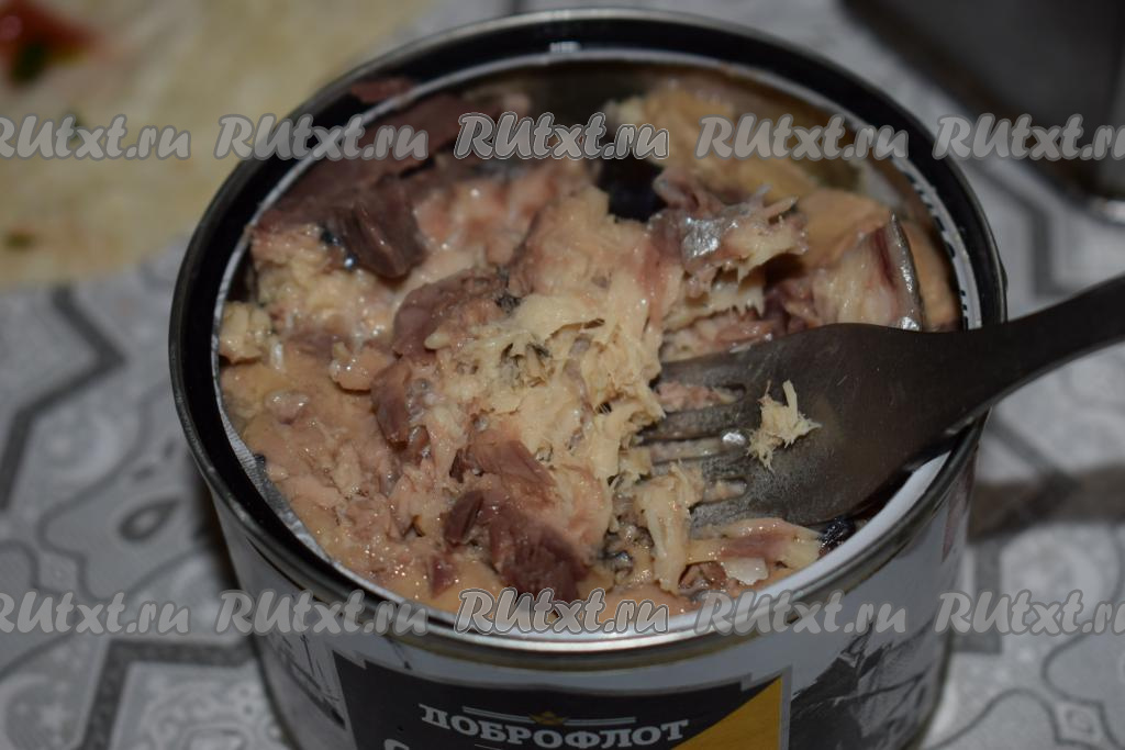 Разминаем вилкой рыбные консервы, удалив предварительно крупные косточки из кусочков.