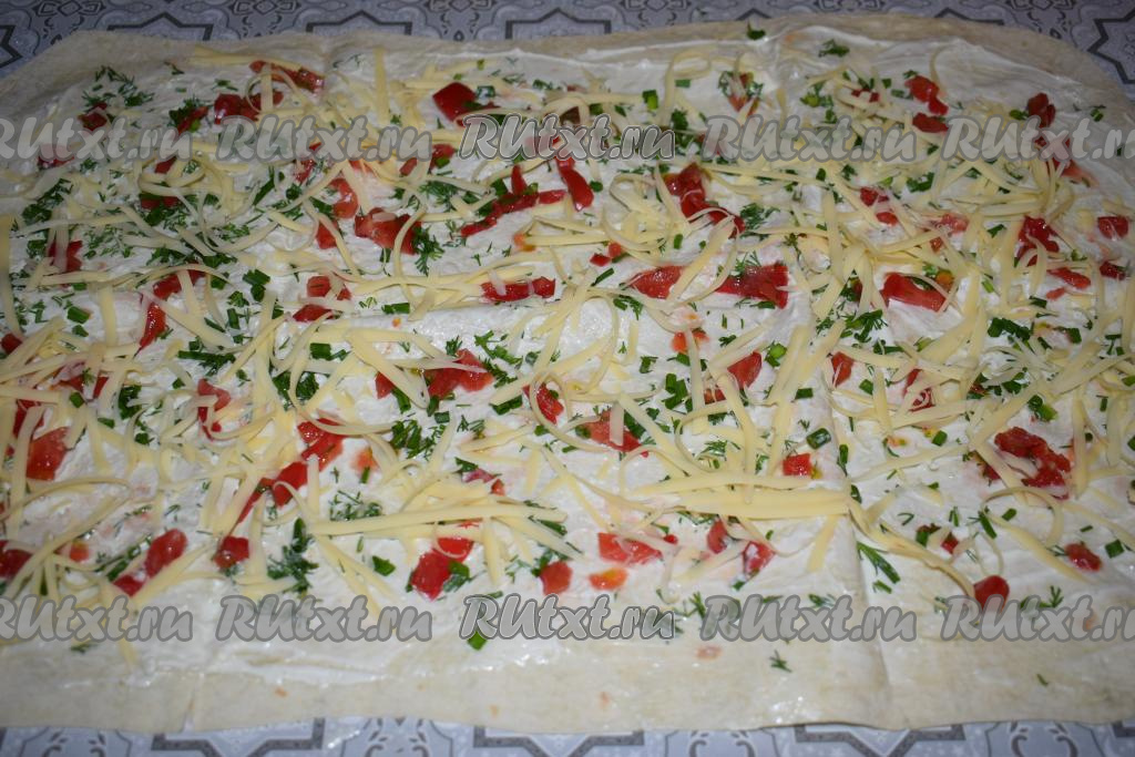 Посыпаем поверхность лаваша сыром, натёртым на крупной тёрке.