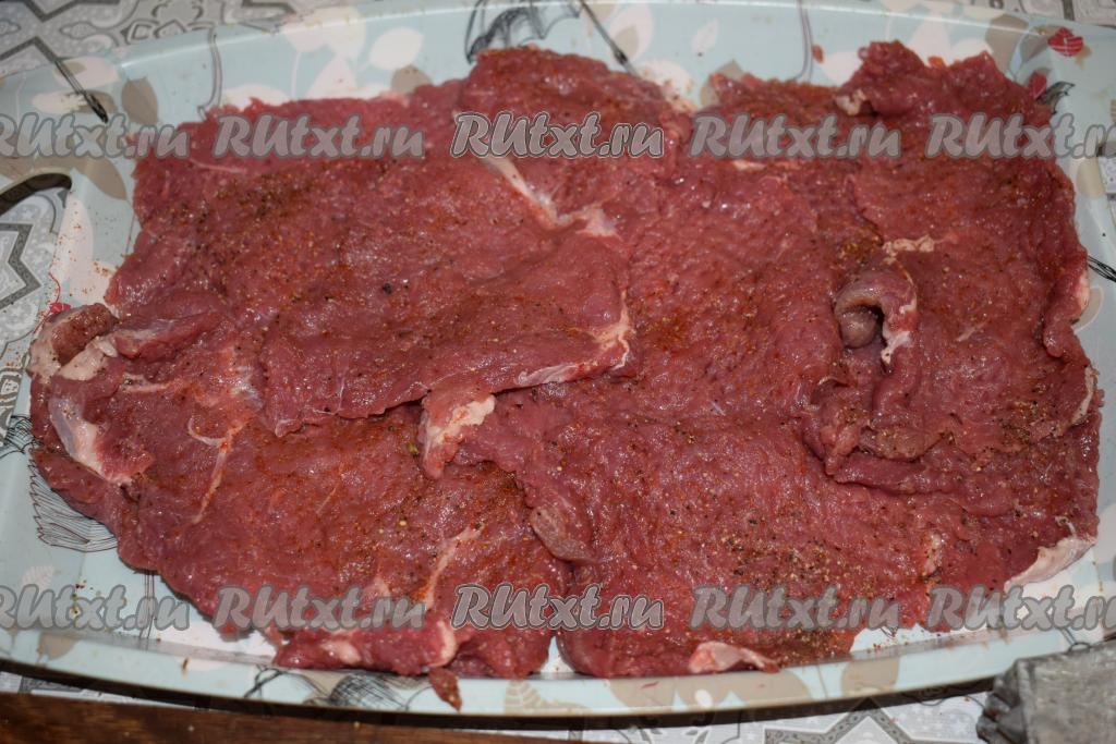 Отбитые кусочки говядины солим и перчим по вкусу, даём постоять минут 15-20, для того чтобы отбивные успели просолиться и пропитаться перцем и специями.