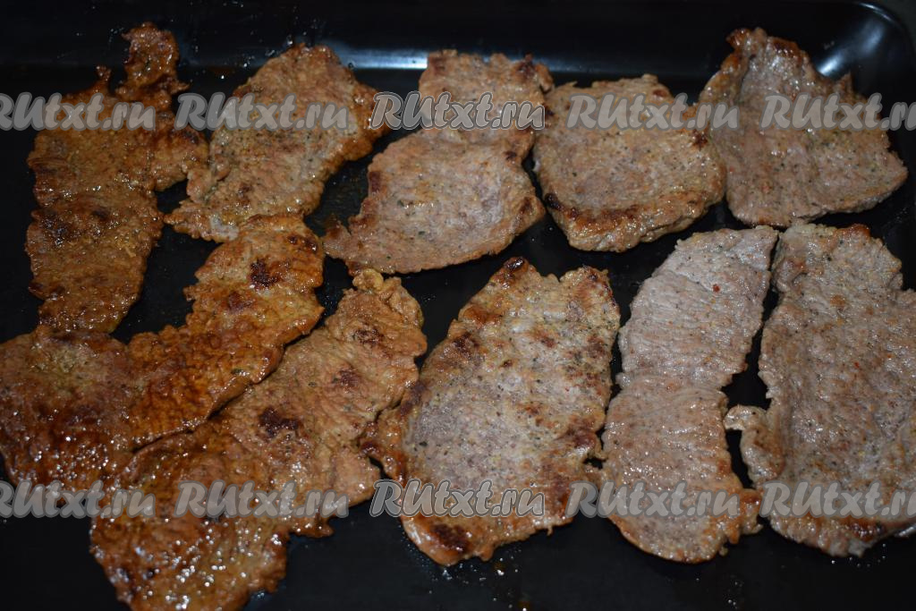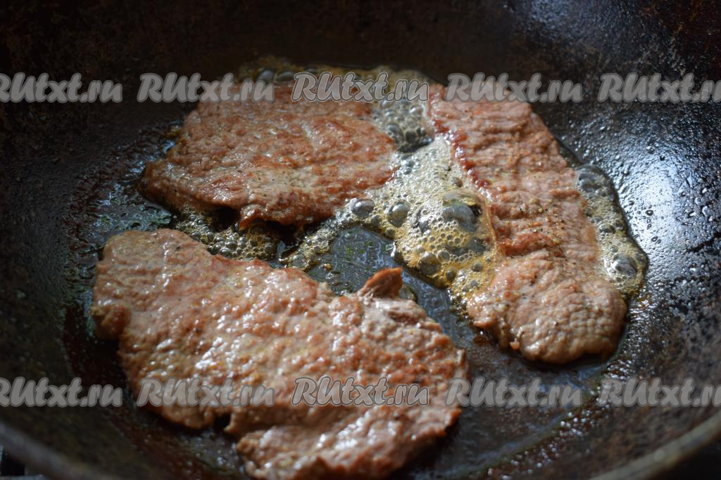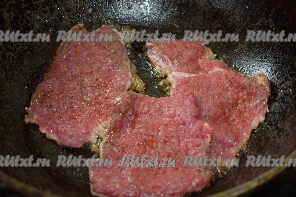 Разогреваем сковороду и выливаем в неё растительное масло. Кладём в разогретое масло отбивные из говядины в один слой и обжариваем на среднем огне, примерно, 8 минут с одной стороны.