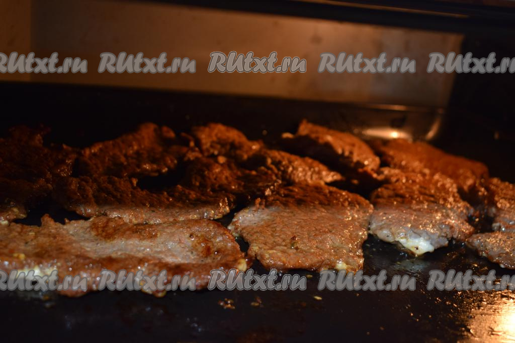 Далее выкладываем на противень нашу обжаренную говядину и сверху каждый кусочек покрываем майонезом. Выливаем на противень 100 мл холодной кипячёной воды и раскладываем кусочки сливочного масла между отбивными. Отправляем противень в разогретую духовку и запекаем отбивные из говядины при температуре 180 градусов, примерно, 20 минут.